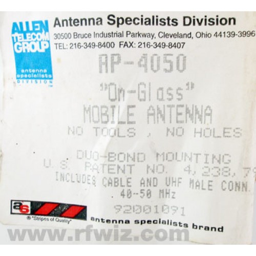The Antenna Specialists AP-4050 is an ON-GLASS Window Mount 40-50 MHz Low Band Mobile Antenna. It uses a unique through-glass coupling system and requires no holes or drilling to install.