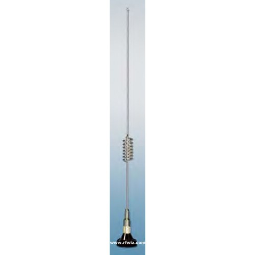 The Comtelco A1143A Base Load UHF 5/8 over 1/4 Wave Design 3dBd Classic BRITE finish Open Coil Mobile Antenna uses a NMO style base and covers 430-490 MHz. It is Base Loaded with a .100 whip and Requires NMO Style Mount and Cable w/Connector to operate. Uncut whip length is approximately 26". Note: Main image is a facsimile, actual item may look slightly different. Specify Center Frequency in order form comments box.