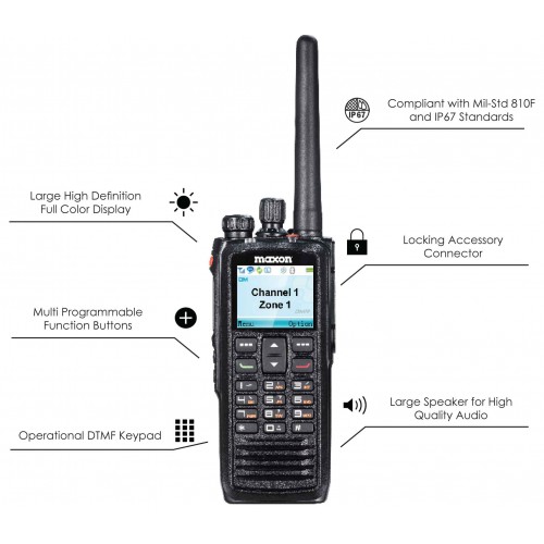 The Maxon TPD-1000 Series DMR Digital Portable Radio are the best choice for any application. The TPD-1000 provides powerful performance and incredible features in a small 5.2 x 2.2 x 1.5” package. The many features make this multi-functioning radio the perfect solution for Public Safety, Security, or Industrial use.